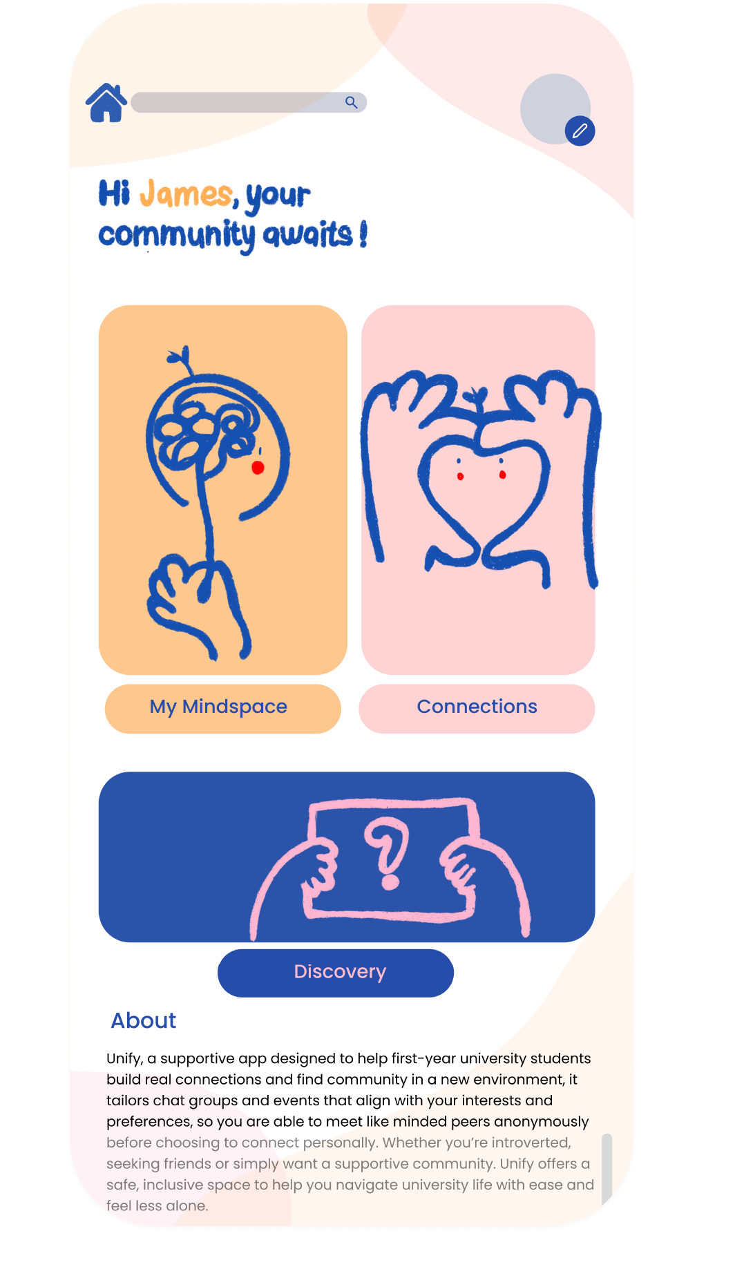 I designed Unify, a wellbeing- led platform that uses emotional design and storytelling to help students feel seen, supported and connected. Through calm visual identity, soft interaction, authentic design. The app encourages intentional connection both online and offline, Unify reframes socialising as something human, personal and emotionally safe.