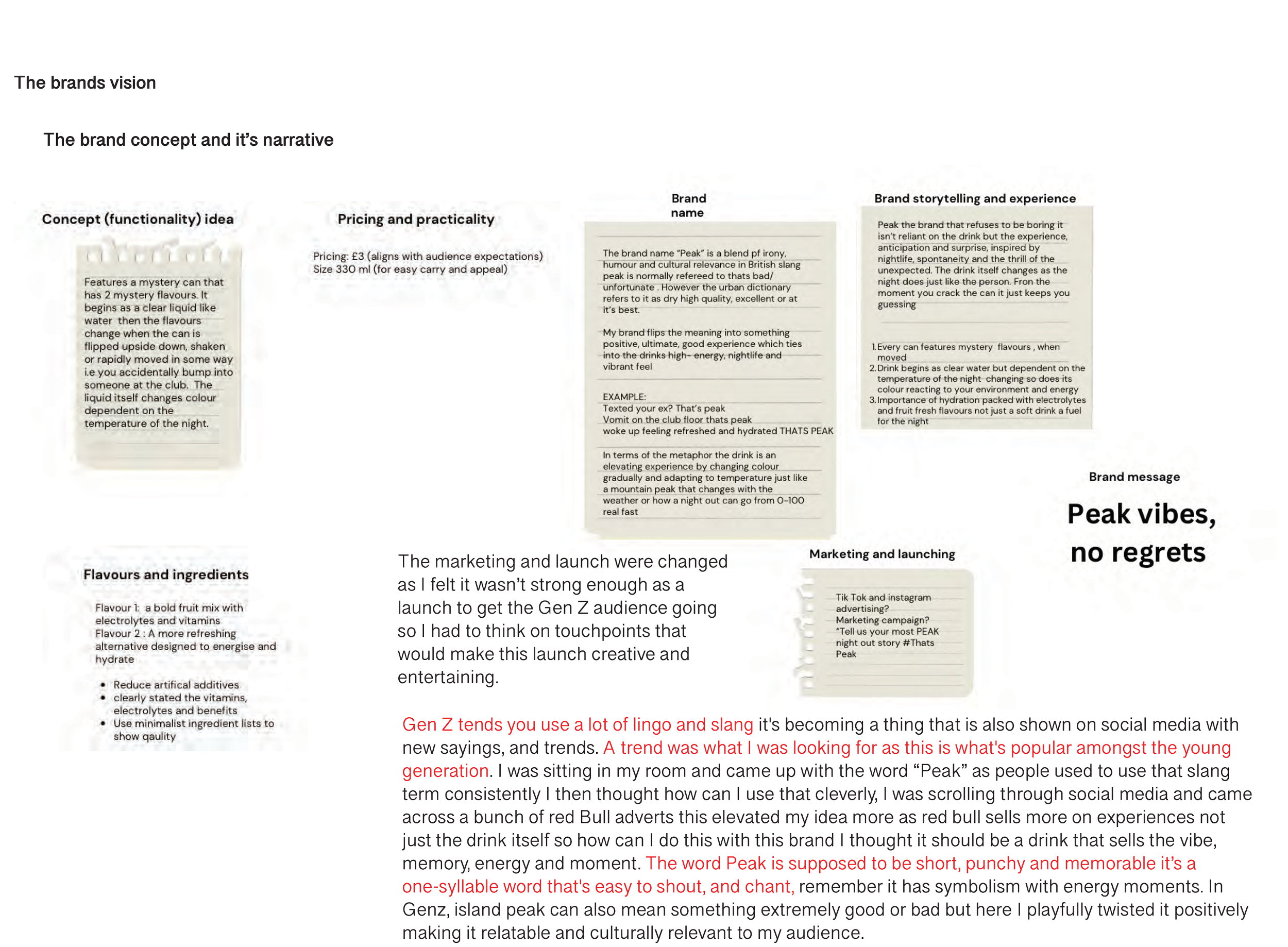 A Seriously Playful non-alcoholic beverage brand, designed to elevate the social experience. Created for Gen z’s who crave connection, chaos and creativity. PEAK transforms sober into high energy feel good memories. It’s unique selling point (USP) is the shake-to-switch can, when shaken it activates a PEAK mode (a playful and refreshing ritual), meaning electrolytes are released mood enhancers, vitamins and the flavour is enhanced. The brand itself extends far beyond than just a can.